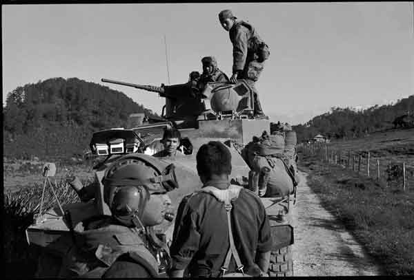 Pictured, Government soldiers man a tank near Patihuitz, a Zapatista village and a regular post for Zapatista Commandante Marcos. In early February 1995, 60,000 Mexican government soldiers fanned into Chiapas in search of Marcos. Larry Towell/Magnum Photos