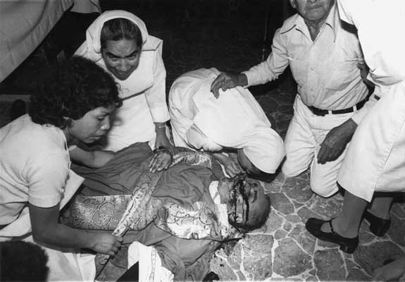 Moments after he is shot, frantic worshipers tend to their fallen priest, Archbishop Romero.