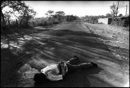 A victim of the right-wing death squads lies in the middle of a highway. January 17, 1981