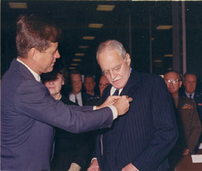 John F. Kennedy pinning a medal on outgoing CIA Director, Allen Dulles, who advised and orchestrated, among other things, the overthrow of the Arbenz government in Guatemala in 1954, the Bay of Pigs invasion of Cuba, and sat on the board of the United Fruit Company.