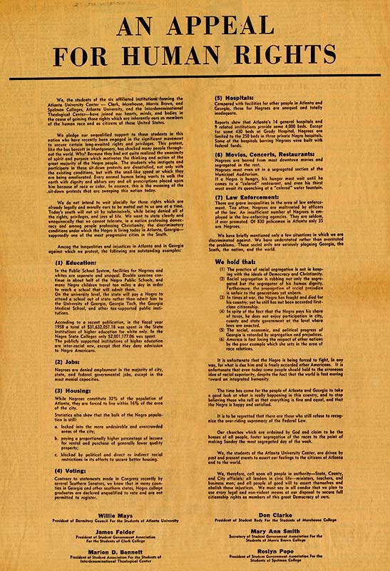 We, the students of the six affiliated institutions forming the Atlanta University Center Clark, Morehouse, Morris Brown, and Spelman Colleges, Atlanta University, and the Interdenominational Theological Center have joined our hearts, minds, and bodies in the cause of gaining those rights which are inherently ours as of the human race and as citizens these United States.