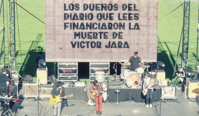 Contemporary Chilean band Los Bunkers perform with a backdrop reading "The owners of the newspaper you read financed the death of Victor Jara." |