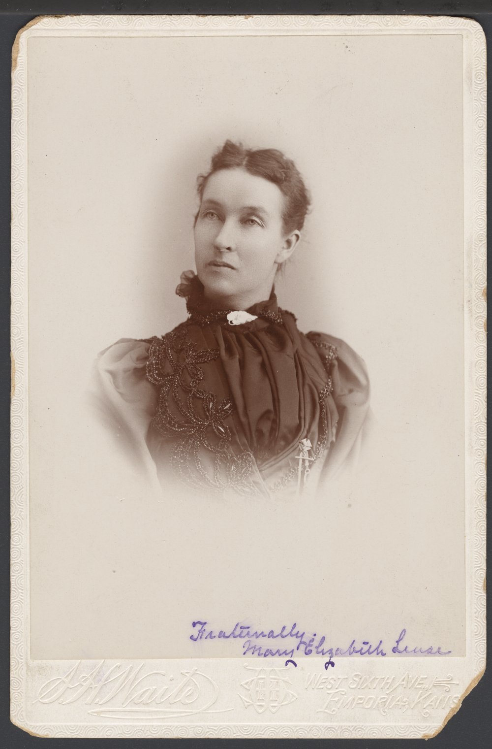 Populist orator Mary Elizabeth Lease, who supposedly advised Kansas farmers to "raise less corn and more hell," was born of Irish immigrant parents in Pennsylvania in 1850. At the age of twenty she came to Kansas to teach school in Osage Mission, and three years later she married Charles L. Lease, a local pharmacist. After unsuccessful farming ventures in Kingman County and in Texas, the Leases and their four children moved to Wichita, where Mary Elizabeth took a leading role in civic and social activities. By 1890, her involvement in the growing revolt of Kansas farmers against high mortgage interest and railroad rates had placed her in the forefront of the People's (Populist) Party, and she stomped all over Kansas as well as the Far West and the South for the cause. She was a powerful and emotional speaker; Emporia editor William Allen White, who did not share her political views, wrote on one occasion that "she could recite the multiplication table and set a crowd hooting and harrahing at her will." More an agitator than a practical politician, by 1896 Lease had become alienated from the Populist Party, and thereafter she turned to personal interests. She divorced her husband in 1902 and spent the rest of her life with one or another of her children in the East until her death in 1933. [Source: Kansas State Historical Society]