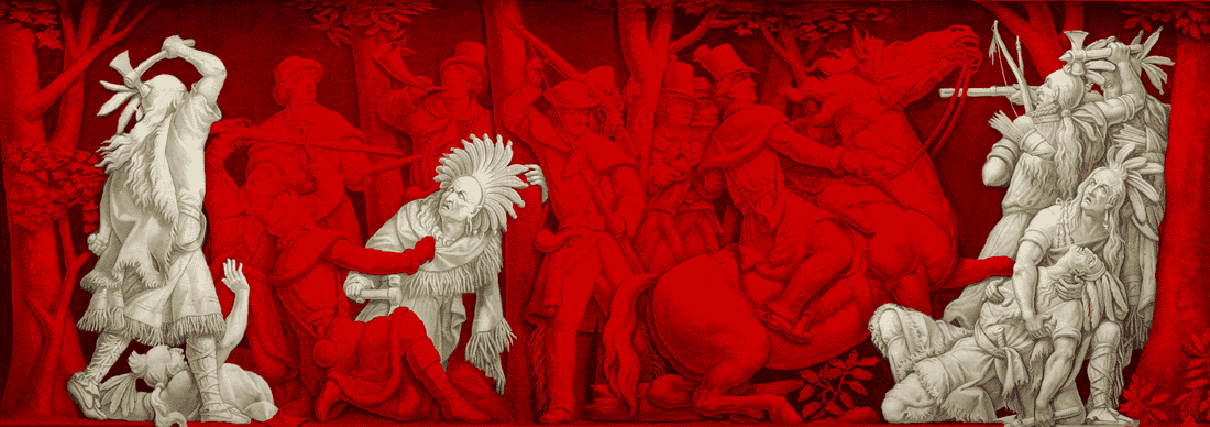 Depicted in a frieze in the U.S. Capitol building dome is the killing of Tecumseh by Colonel Richard Johnson at the Battle of the Thames in Upper Canada during the War of 1812. Tecumseh and his followers joined forces with the British to resist the encroachment of settlers on Indian territory. With Tecumseh's death, however, the momentum and power of the Indian confederacy was broken. Colonel Johnson, a Kentucky slavemaster, later served as a congressman and vice-president.