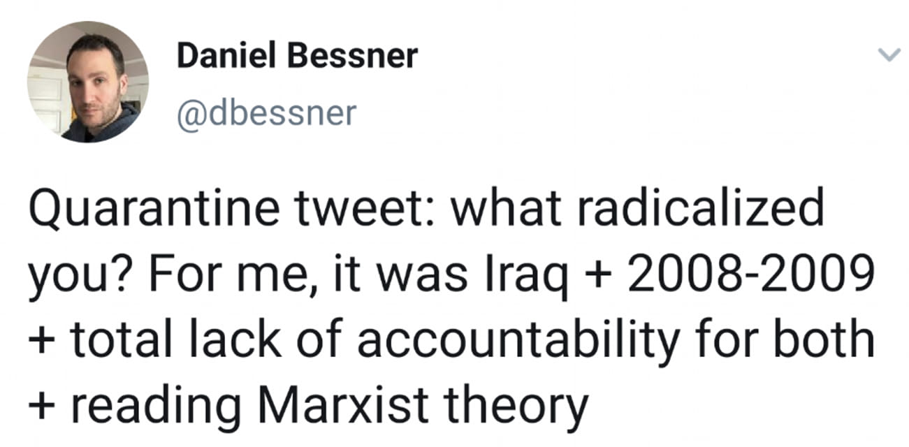 On April 2, 2020; University of Washington Historian and Jacobin Contributing Editor Daniel Bessner asked a simple question on Twitter: "What radicalized you?" We stumbled across a repost of it on facebook with hundreds of responses and, after reading all of them, we followed up on Twitter and read all of those. Then we sat and down and copied and pasted almost all of them (it's easy to lose one or two here or there when copying and pasting hundreds of individual responses). We think it's great. We've started adding links to help people who stumble across this list who are looking to add to their radicalization.