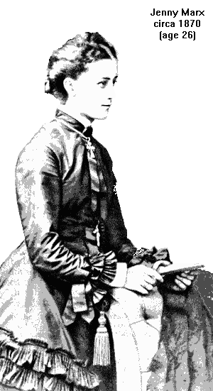 First daughter of Karl and Jenny. Journalist. Married Charles Longuet in 1872. Died shortly before her father. Married to Charles Longuet. Mother of six children. In 1870 she took action in the Irish struggles by publishing (under the name "J. Williams") revelations of the treatment of the Irish political prisoners by the English bourgeoisie. An investigation by the Gladstone government followed. Send corrections, comments to Sally Ryan.