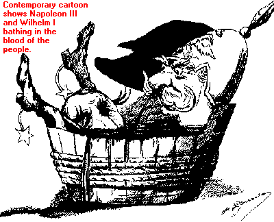 Political cartoon of Napoleon III and Wilhelm I bathing together in the blood of the people