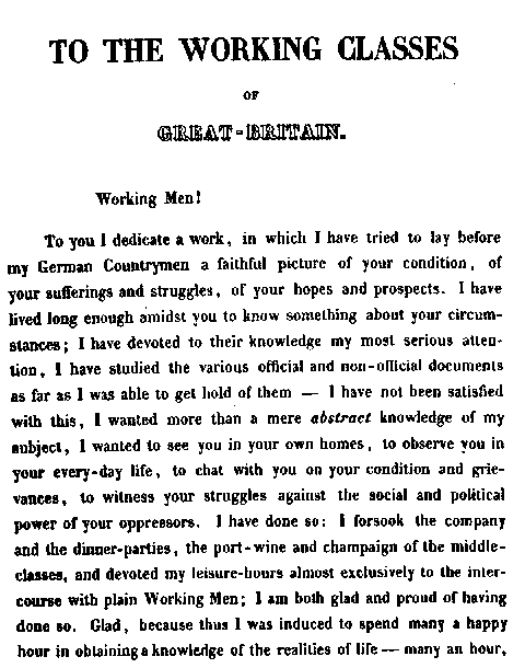 277 286 290 The Condition of the Working-Class in England. From Personal Observation and Authentic Sources (Engels) 295 297 302 307 The State of the Workers before the Industrial Revolution.-The Jenny.-Emergence of the Industrial and the Agricultural Proletariat.- The Throstle, the Mule, the Power-Loom, the Steam Engine.-The Victory of Machinery Work over Hand-Work.-The Development of Industrial Might.-The Cotton Industry.-The Hosiery Manufacture.-The Manufacture of Lace.-Dyeing, Bleaching, Printing.- The Manufacture of Wool.-The Linen Trade.-The Manufacture of silk.-The Production and Manufacture of Iron.-Coal Mining.- The Production of Pottery.-Agriculture.-Roadways, Canals, Railroads, Steamboats.-Summary.-The Emergence of the Proletariat as a Factor of National Importance.-The Middle Class' View of the Workers.