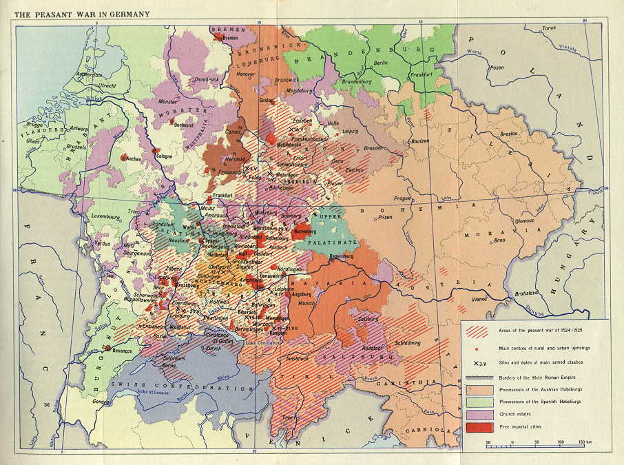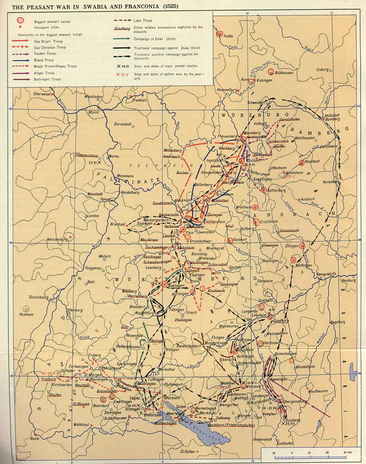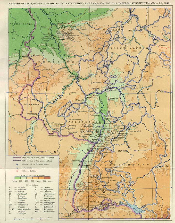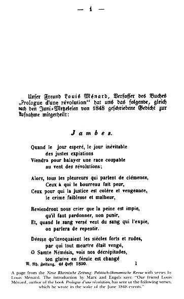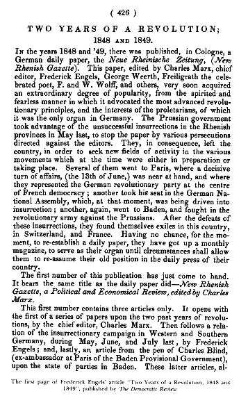 Cover of the Neue Rheinische Zeitung. Politisch-okonomische Revue 43 A map of Rhenish Prussia, Baden and the Palatinate during the campaign for the Imperial Constitution (May-July 1849) 192-3 A page from the Neue Rheinische Zeitung. Politisch-okonomische Revue with verses by Louis Menard. The introduction by Marx and Engels says: "Our friend Louis Menard, author of the book Prologue d 'une revolution, has sent us the following verses, which he wrote in the wake of the June 1848 events. " 289 The first page of Frederick Engels' article "Two Years of a Revolution; 1848 and 1849", published by The Democratic Review 355 A map of the Peasant War in Germany 448-9 A map of the Peasant War in Swabia and Franconia (1525) 472-3 The first page of Karl Marx's article "The Constitution of the French Republic", which appeared in Notes to the People 573